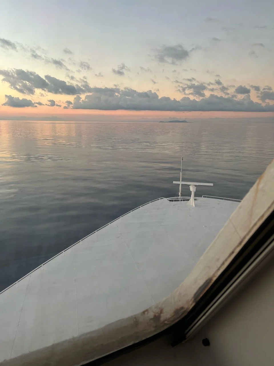 C’est la première fois qu’on passe une nuit sur un paquebot de cette taille. On s’est pris une chambre individuelle pour l’occasion, avec une belle vue sur l’avant du bateau.