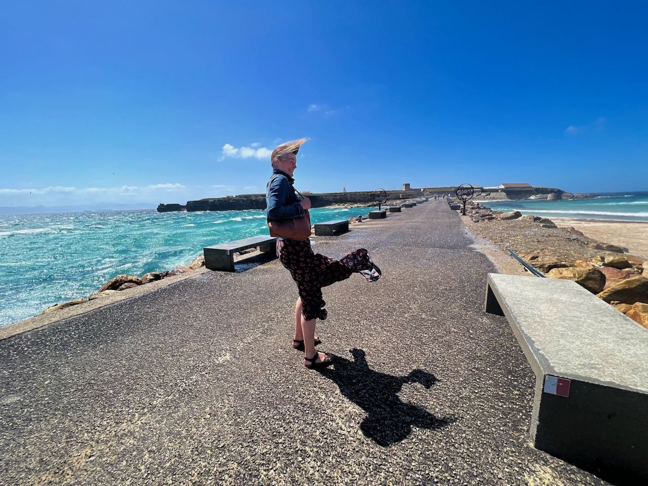 Tarifa marque la pointe Sud de l’Europe de l’Ouest et l’entrée dans le détroit de Gibraltar. A droite, l’Atlantique, à gauche, la Méditerranée. Au milieu, une jetée est balayée par des vents vraiment impressionnants. On s’envole ! Les vagues s’échouent à une dizaine de mètres, sinon la jetée serait impraticable, mais le vent balance des giclées d’eau de mer bien trempées.