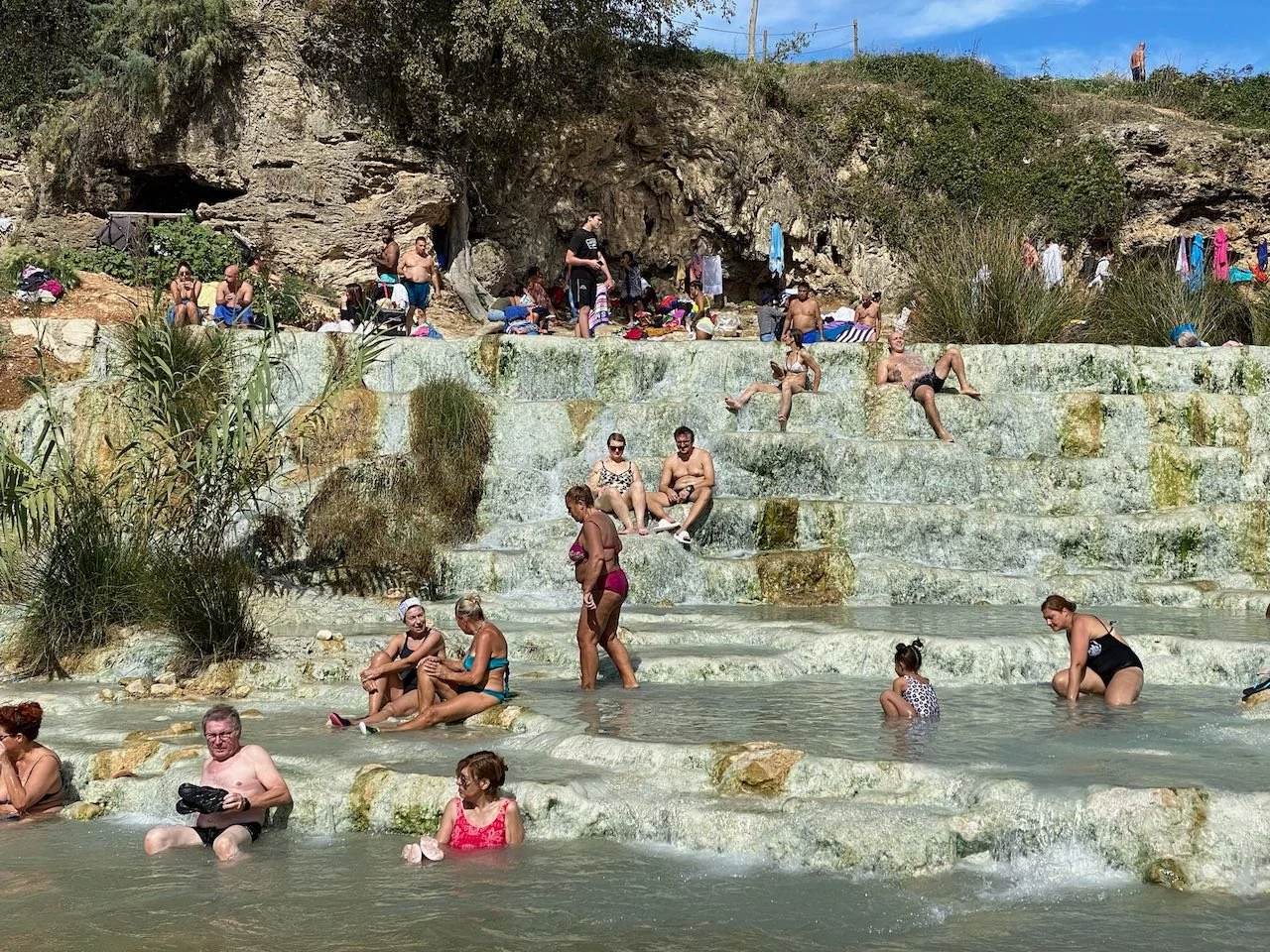 Le lendemain, nous allons nous baigner dans les sources volcaniques de Saturnia. On choisit le site des Cascades, à la fréquentation très familiale en ce dimanche. Je n’ai pas encore bien la technique pour m’enduire des boues noires, mais pour me faire masser par la cascade, c’est impeccable.