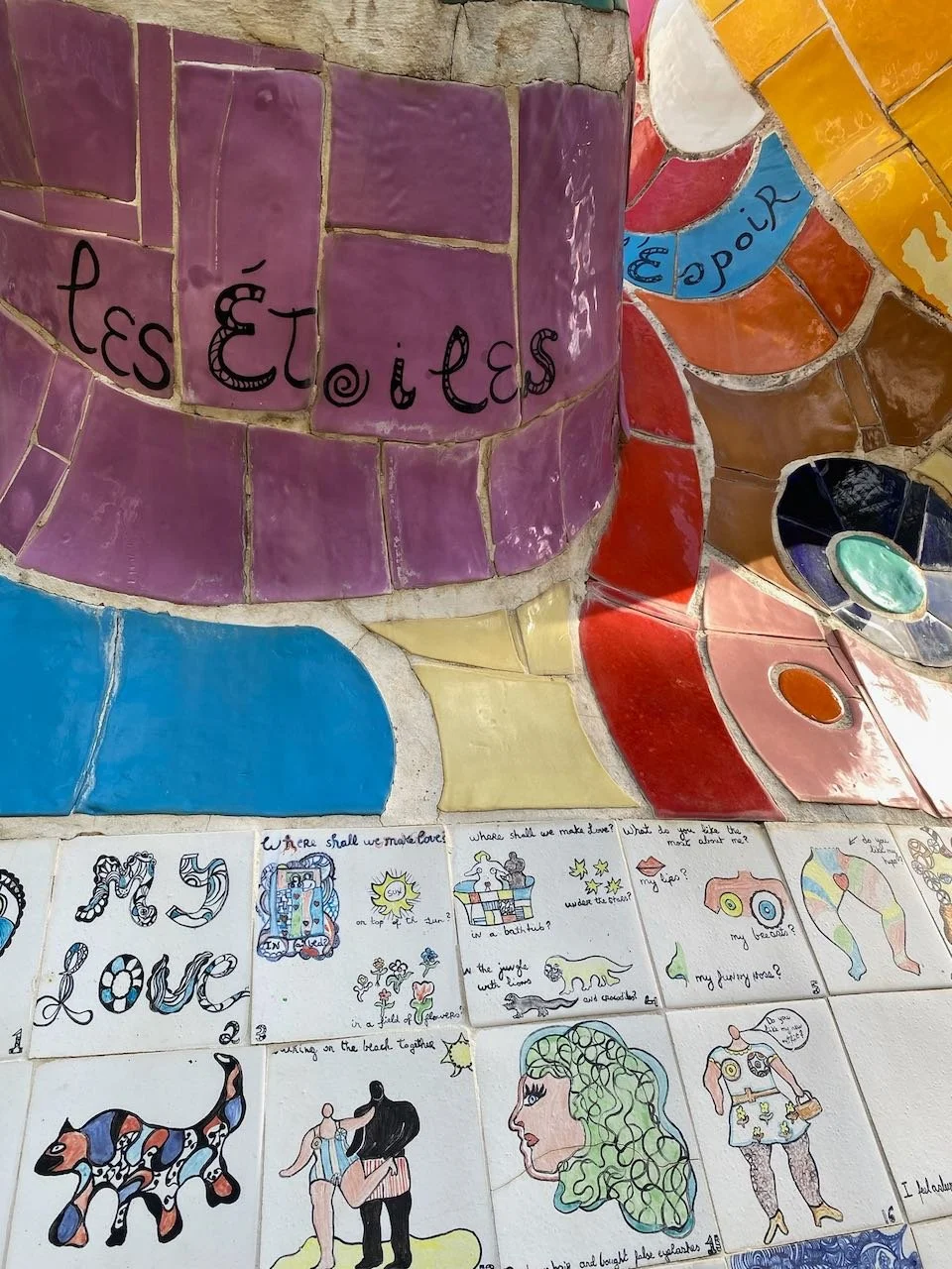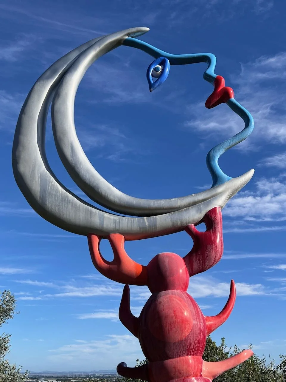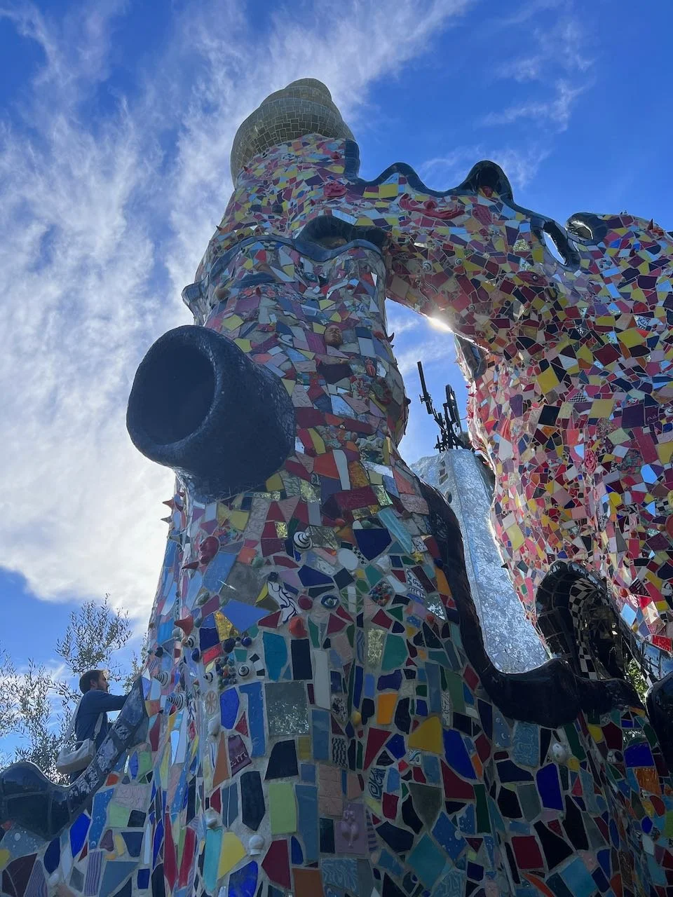Notre destination suivante est le jardin des Tarots de Niki de Saint Phalle. L’artiste a travaillé plus de vingt ans à construire ce parc où elle a représenté en sculptures géantes les 22 arcanes du Tarot, en collaboration avec son mari sculpteur Jean Tinguely. Là aussi, ambiance très familiale. On est porté par l’inventivité, la diversité, la fantaisie et la créativité de ce projet démesuré.