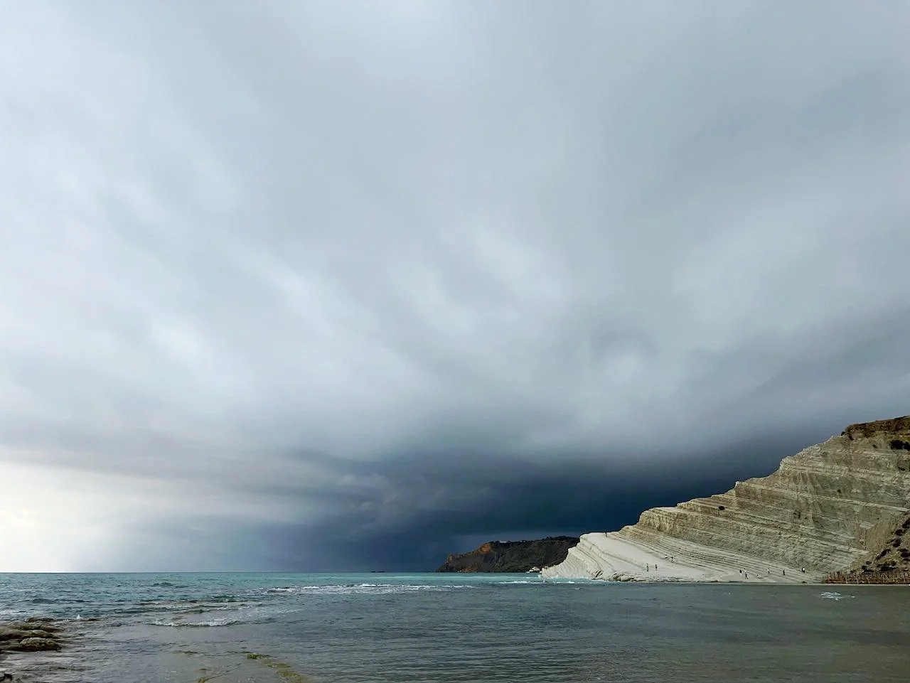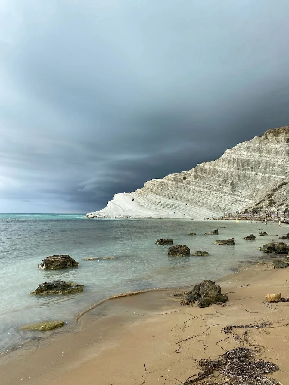 On remonte dans la voiture, direction les falaises plates et blanches de Scala dei Turchi, aperçues depuis la plage. Quand on y arrive, le ciel a pris une couleur orageuse dont on devrait commencer à se méfier. Mais la lumière est si belle: telle des papillons elle nous attire au plus près des pierres blanches auréolées du ciel gris foncé.