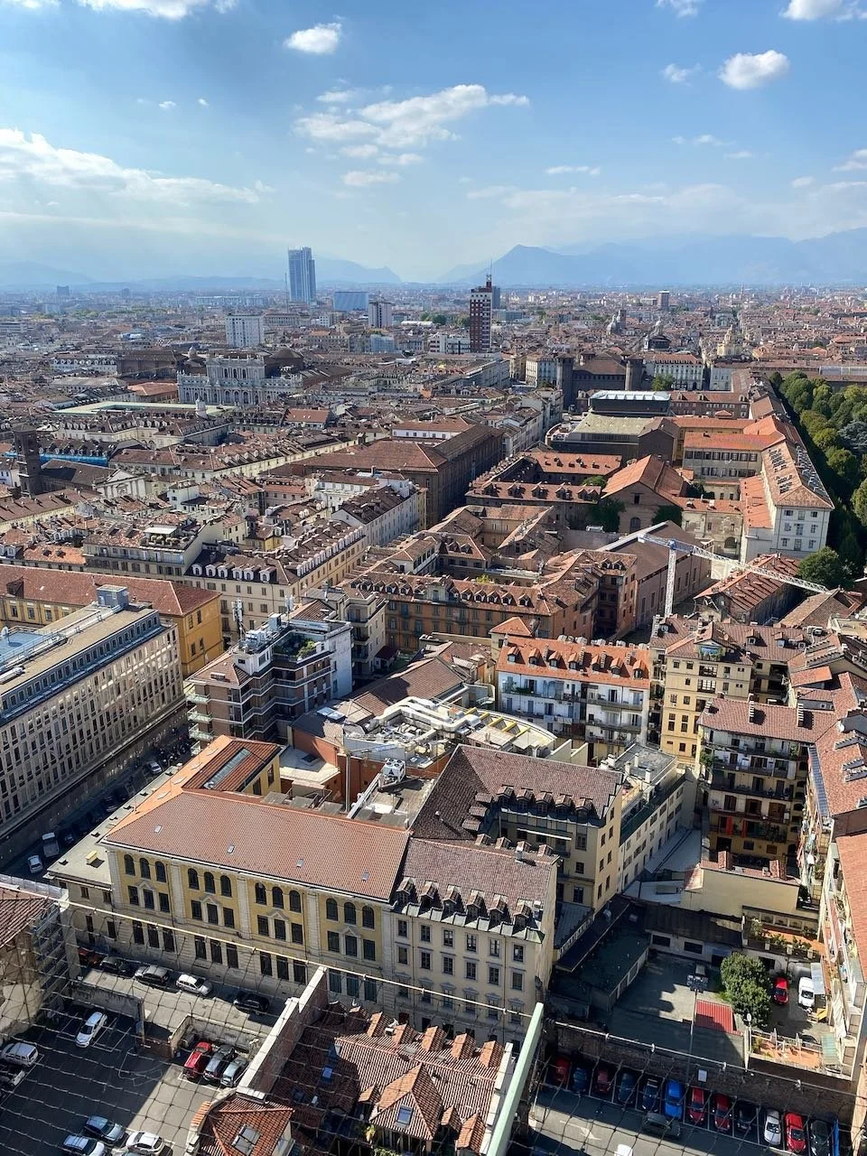 On visite ensuite le Mole Antonelliana, le musée du cinéma, un bâtiment magnifique, qui culmine à 120 mètres de hauteur. L’ascenseur qui nous mène au sommet nous fait traverser les étages d’exposition, construites comme des niches, on se sent comme à l’intérieur d’un décor géant. Et en haut, quelle vue !