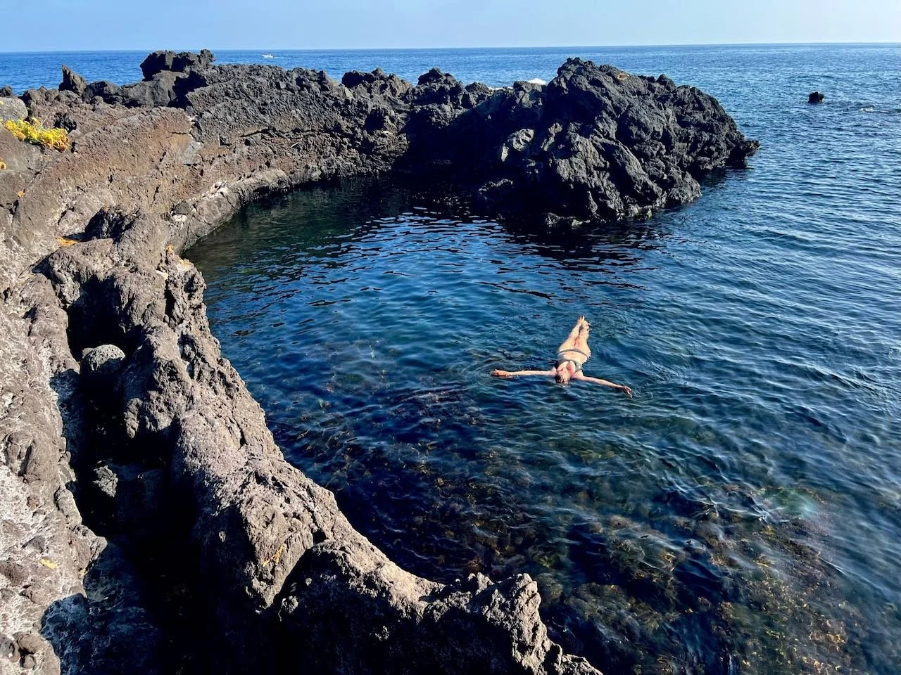 On décide de jouer les contrastes et de finir la journée au bord de la mer. On se promène le long de la côte, d’un petit village à l’autre : Acireale, Pozzillo, Santa Tecla, avant de trouver la crique parfaite.