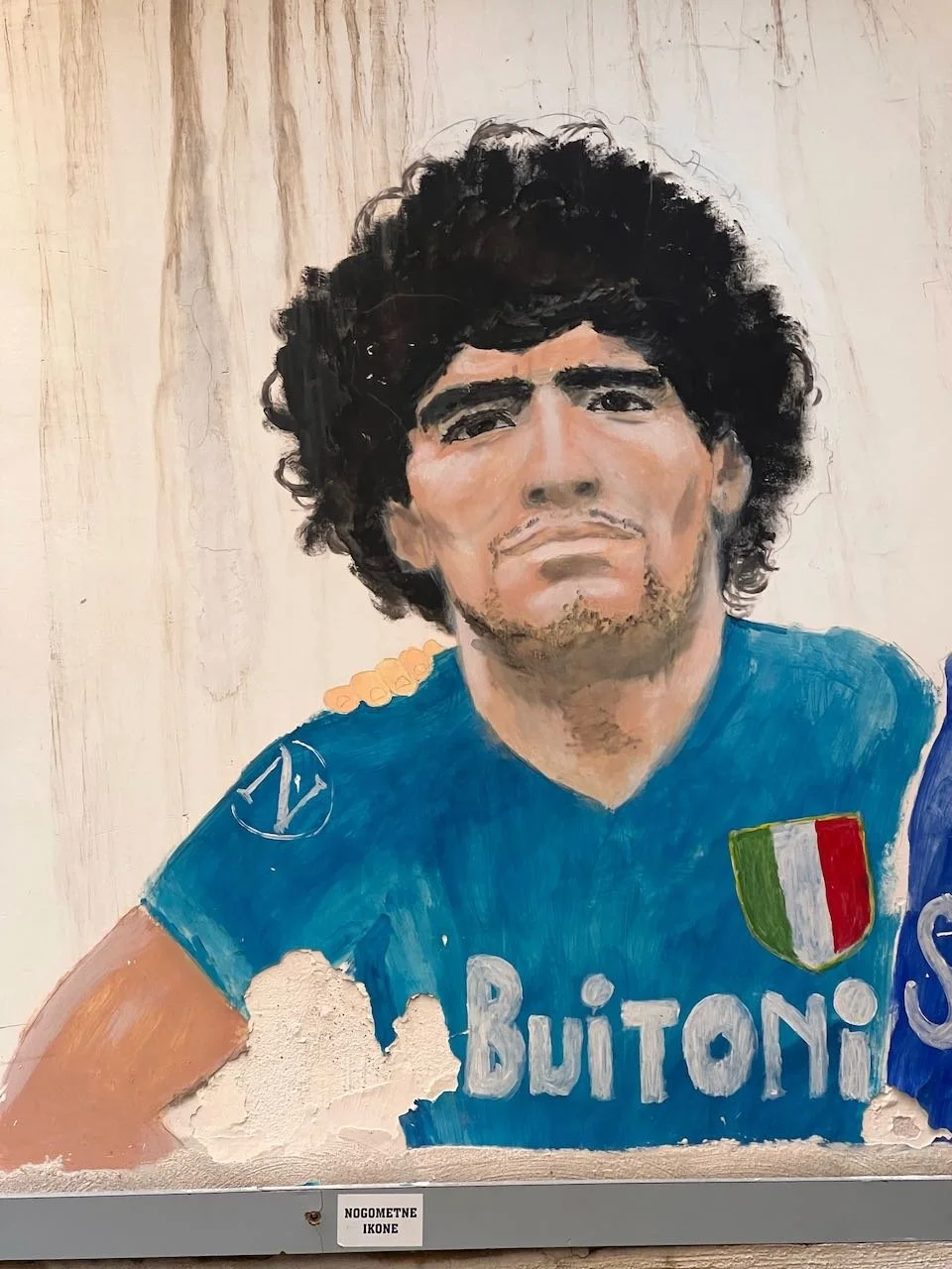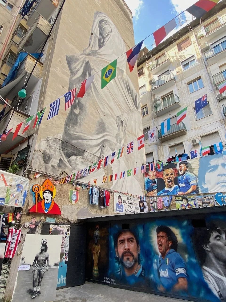 Diego Maradona en est le saint patron, le Dieu, le D10S - le numéro de son maillot à Naples. Son effigie est partout, et une placette lui est dédiée.