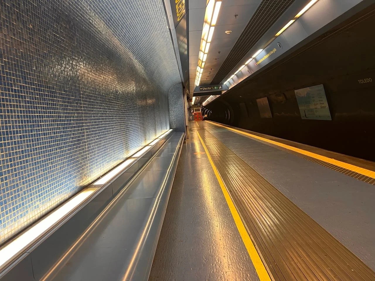 La Linea 1 nous conduit en quelques stops à la station Toledo, qui est en effet particulièrement spectaculaire avec son revêtement de mosaïques bleues et son puits de lumière.