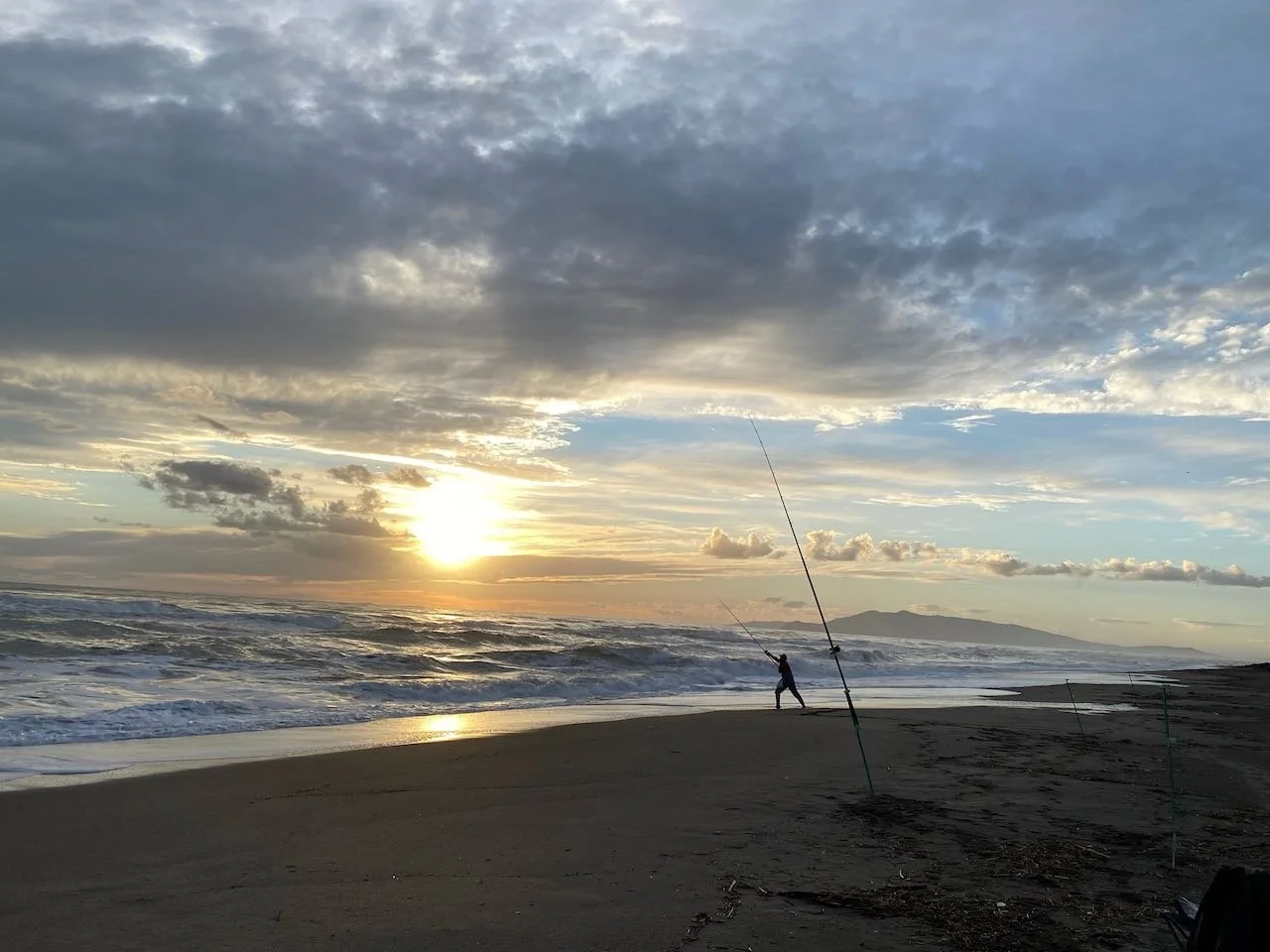 Seuls sur la plage avec un unique pêcheur.
