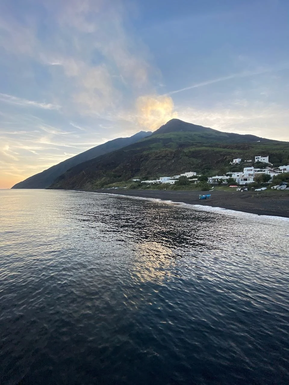 L’ile, dominée par le volcan éponyme, est toute petite, environ 6 km de diamètre. La lave du volcan en activité coule toujours sur la même face, la Sciara del Fuoco. Le reste de l’île est paisible et accueillant, offrant un contraste bienvenu avec l’aridité des derniers paysages siciliens traversés. C’est simple et beau. Le sable est noir, les maisons blanches et il y a beaucoup de jardins. L’absence des voitures contribue grandement au charme de l’endroit: ne circulent que des petits Piaggio trois roues, des scooters, quelques vélos et trottinettes. Il y a peu de touristes, les vacances de la Toussaint n’ont pas encore commencé et on est à peine une vingtaine à débarquer.