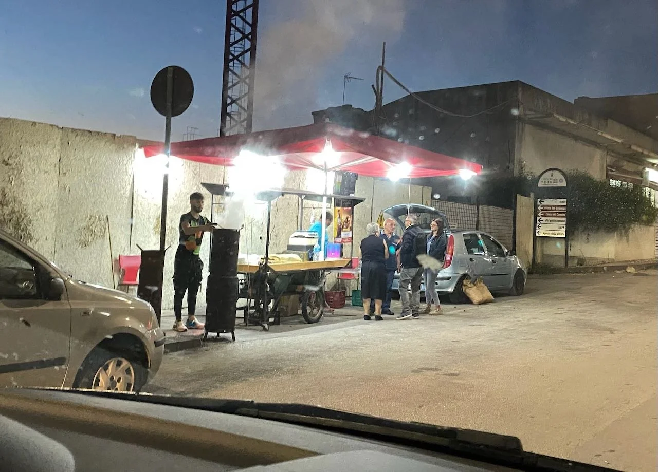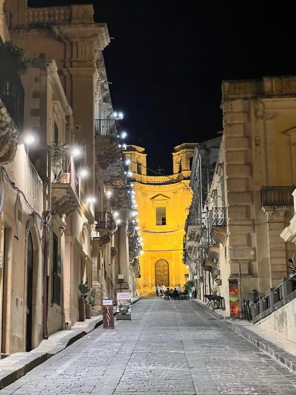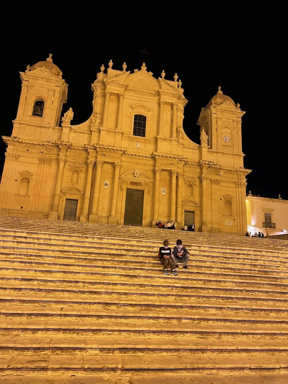 On se pose près de Noto, où on passera deux belles soirées. La ville a été ravagée par un tremblement de terre au 17e siecle, et entièrement reconstruite quelques kilomètres en aval. Elle est très différente des villes visitées jusqu’ici: les rues sont plus larges, perpendiculaires, et surtout dans un style baroque rococo assumé. On aime surtout l’atmosphère : peut-être parce qu’on y dîne un vendredi puis un samedi soir, mais il y règne une douceur de vivre très agréable. Les enfants jouent sur les places piétonnes, les jeunes filles y répètent leur choré TikTok, les garçons comparent leur coupe de footballers, les pères essaient d’endormir leur bébé en sautillant, les vieilles dames locales rient fort autour de leur banc, des guitaristes chantent au pied des marches. Nous sommes charmés.